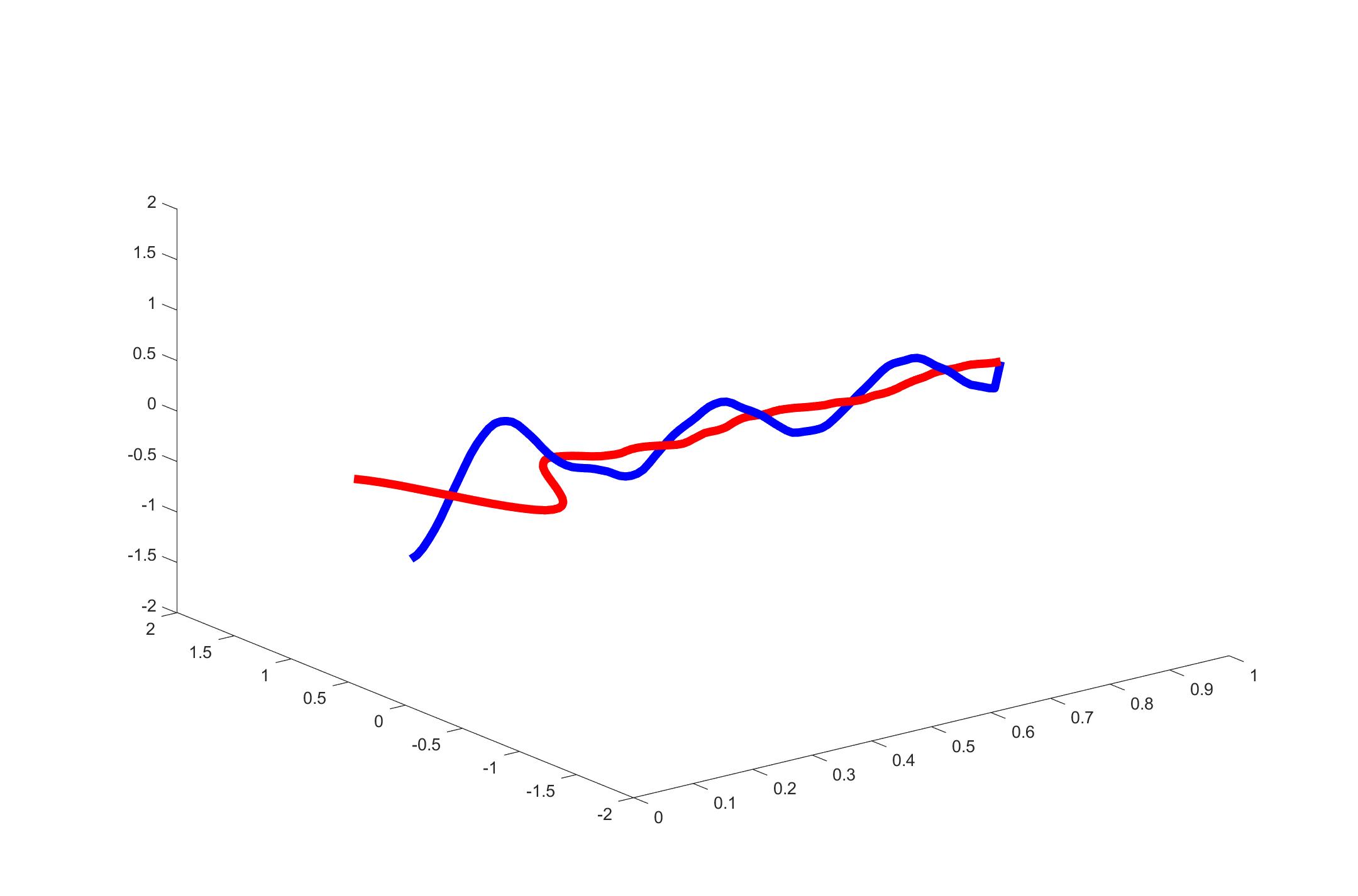 1clear; clc;2ke = 100;3% Position of the source4ks = 1;5% ks = ke / 2;6% Number of time steps7nsteps = 3000;8% Cell size and time stepping9c0 = 3.e8;10dz = 0.01;11dt = dz / (2 .* c0);12% Constants13cc = c0 * dt / dz;14% Initialize vector15ex = zeros(1, ke);16hy = zeros(1, ke);17space = zeros(1, ke);18for k = 1:ke19 space(k) = k*dz;20end21empty = zeros(1, ke);22% sine wave23amp = 0.5;24omg = 0.1;25for t = 1:nsteps26 % E field loop27 for k = 2:ke - 128 ex(k) = ex(k) + cc * (hy(k - 1) - hy(k));29 end30 % Source31 ex(ks) = amp* sin( omg* t );32 % H field loop33 for k = 1:ke - 134 hy(k) = hy(k) + cc * (ex(k) - ex(k + 1));35 end36 clf37 plot3(space,ex,empty, 'r', 'LineWidth', 5 ); 38 axis([0 1 -2 2 -2 2]);39 set(gcf,'Position',[200 200 1080 720]); 40 hold on41 plot3(space,empty,hy, 'b', 'LineWidth', 5 ); 42 pause(0.001);43endThe result is as follows.