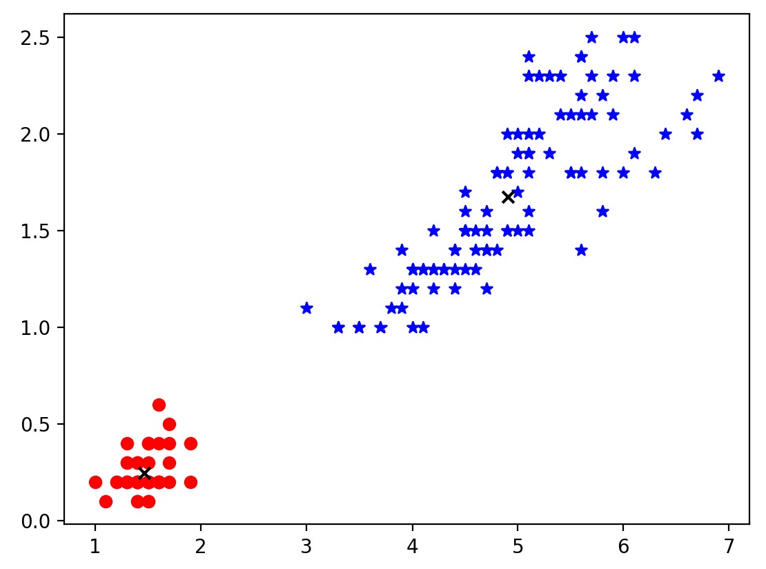 46for i in range(iter):47 # re-calculate centroids 48 new0_list=[]49 new1_list=[]50 for i in range(M):51 point=(x_value[i],y_value[i])52 if distance(p0,point)<distance(p1,point): 53 plt.scatter(point[0],point[1],c='blue',marker='*')54 new0_list.append(point)55 else:56 plt.scatter(point[0],point[1],c='red')57 new1_list.append(point)58 # get new centroids 59 dt_temp0=pd.DataFrame(new0_list,columns=['x','y'])60 p0=(np.average(dt_temp0['x']),np.average(dt_temp0['y']))61 dt_temp1=pd.DataFrame(new1_list,columns=['x','y'])62 p1=(np.average(dt_temp1['x']),np.average(dt_temp1['y']))63 plt.scatter(p0[0],p0[1],c='black',marker='x')64 plt.scatter(p1[0],p1[1],c='black',marker='x')65 plt.show()66 # update distance67 for i in range(M):68 point=(x_value[i],y_value[i])69 if distance(p0,point)<distance(p1,point): 70 plt.scatter(point[0],point[1],c='blue',marker='*')71 else:72 plt.scatter(point[0],point[1],c='red')73 plt.scatter(p0[0],p0[1],c='black',marker='x')74 plt.scatter(p1[0],p1[1],c='black',marker='x')75 plt.show()The result is as follows.