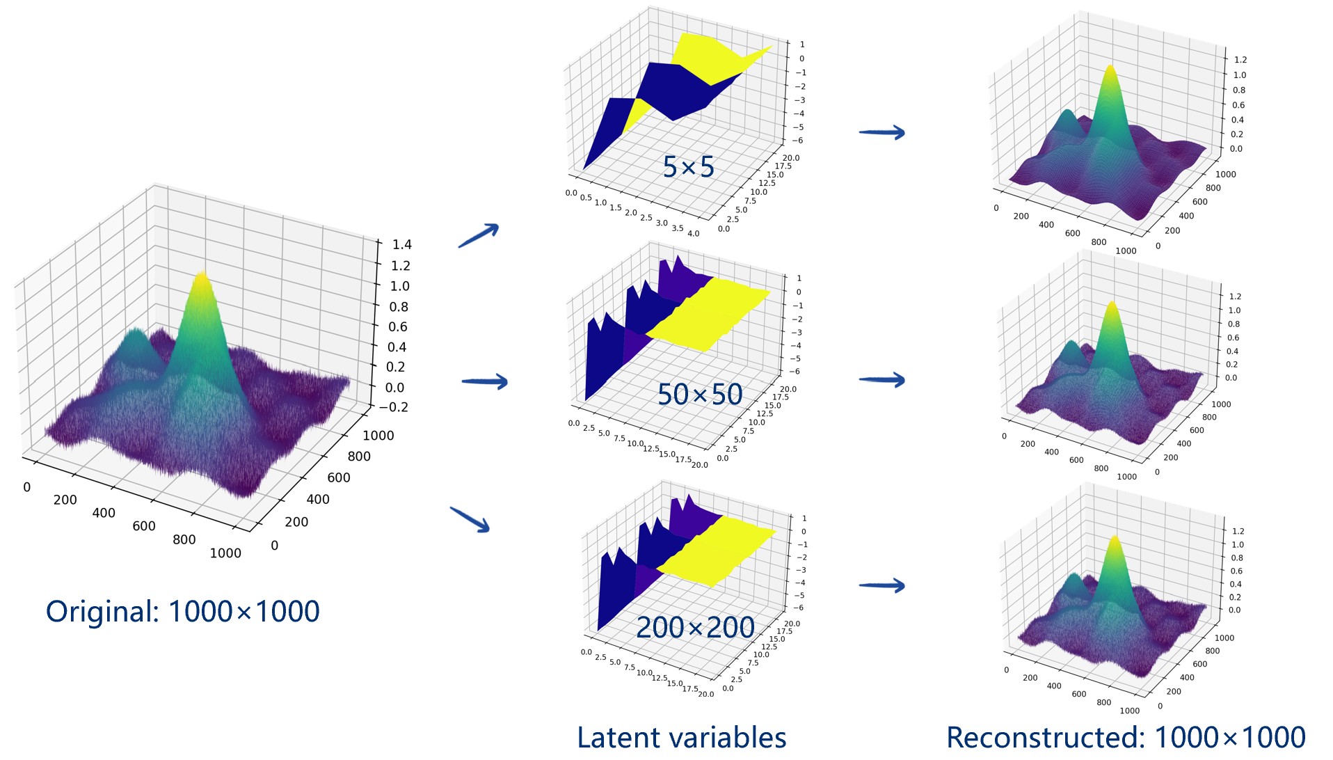 46fig1 = plot_surface(Z_orig, '1. Original data (1000×1000)')47fig2 = plot_surface(Z_low[:20, :20], '2. Latent variables', cmap='plasma')48fig3 = plot_surface(Z_recon, '3. Reconstructed data (1000×1000)')49