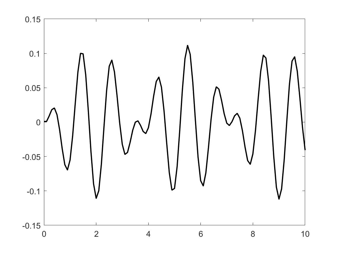 1clear; clc;2m=0.1;3k=2; 4% forced vibration5Fmag=0.1; 6% natrual = sqrt(k/m)/2/pi 7% 0.7118 will cause resonance8freq=1; 9omg=freq*2*pi;10% damp11c=0;12% time13dt = 0.1; 14tend = 10;15t_ = 0 : dt : tend;16d = zeros(length(t_), 1);17d(2) = 0.001;18a=k*d(2);19d(1) = d(2)+dt^2/2*a;20for n = 2 : length(t_)-121 t = t_(n);22 F = Fmag*cos(omg*t);23 rhs = F - (k-2/dt^2*m)*d(n) - (m/dt^2-c/2/dt)*d(n-1);24 coef = m/dt^2 + c/2/dt;25 d(n+1) = rhs/coef;26 clf27 plot(t_, d, 'k', "LineWidth", 1.5)28 hold on29 pause(0.01);30endThe result is as follows. With different input parameters, the vibration differs a lot.